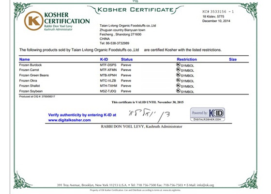 日前,泰安綠龍有機食品有限公司順利通過歐美“KOSHER”認證。 2014年11月9日至10日,“KOSHER”認證機構審核人員參觀了泰安綠龍公司的生產(chǎn)現(xiàn)場,并對公司的質(zhì)量和環(huán)境管理體系進行了嚴格的考察、評估,12月10日,綠龍公司取得“KOSHER”認證證書!