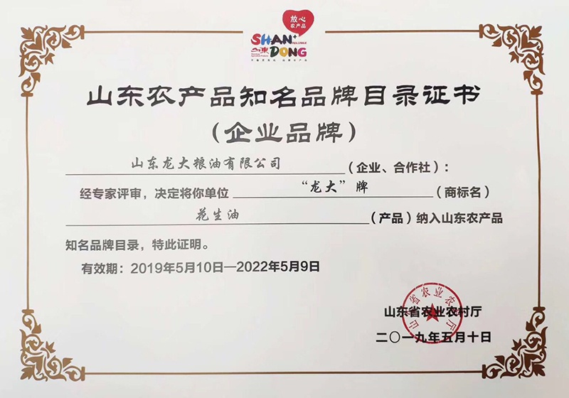 龍大花生油獲評山東省第四批知名企業(yè)產(chǎn)品品牌
